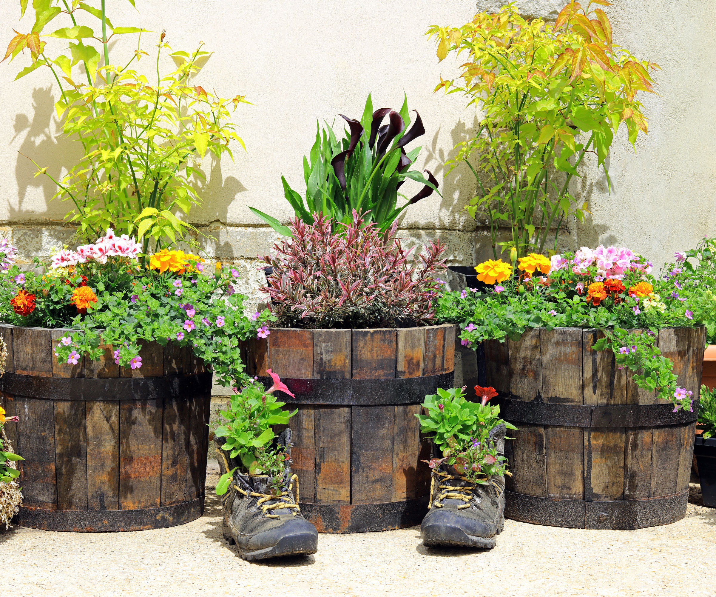 Se avete intenzione di piantare un arbusto o un albero di grandi dimensioni nel vostro contenitore, come un albero da frutto nano o un acero giapponese, assicuratevi che il vaso sia abbastanza grande da contenere un esemplare maturo. Pianificate sempre in anticipo l’altezza e l’ampiezza della pianta matura, soprattutto nel caso di arbusti da frutto. Finché l’albero non cresce, potete circondare la pianta con piante annuali, alcune ricadenti o rampicanti. Con l’albero come punto focale, potete includere alcuni vasi più piccoli in un gruppo. I gruppi di tre sono sempre una buona scelta stilistica!