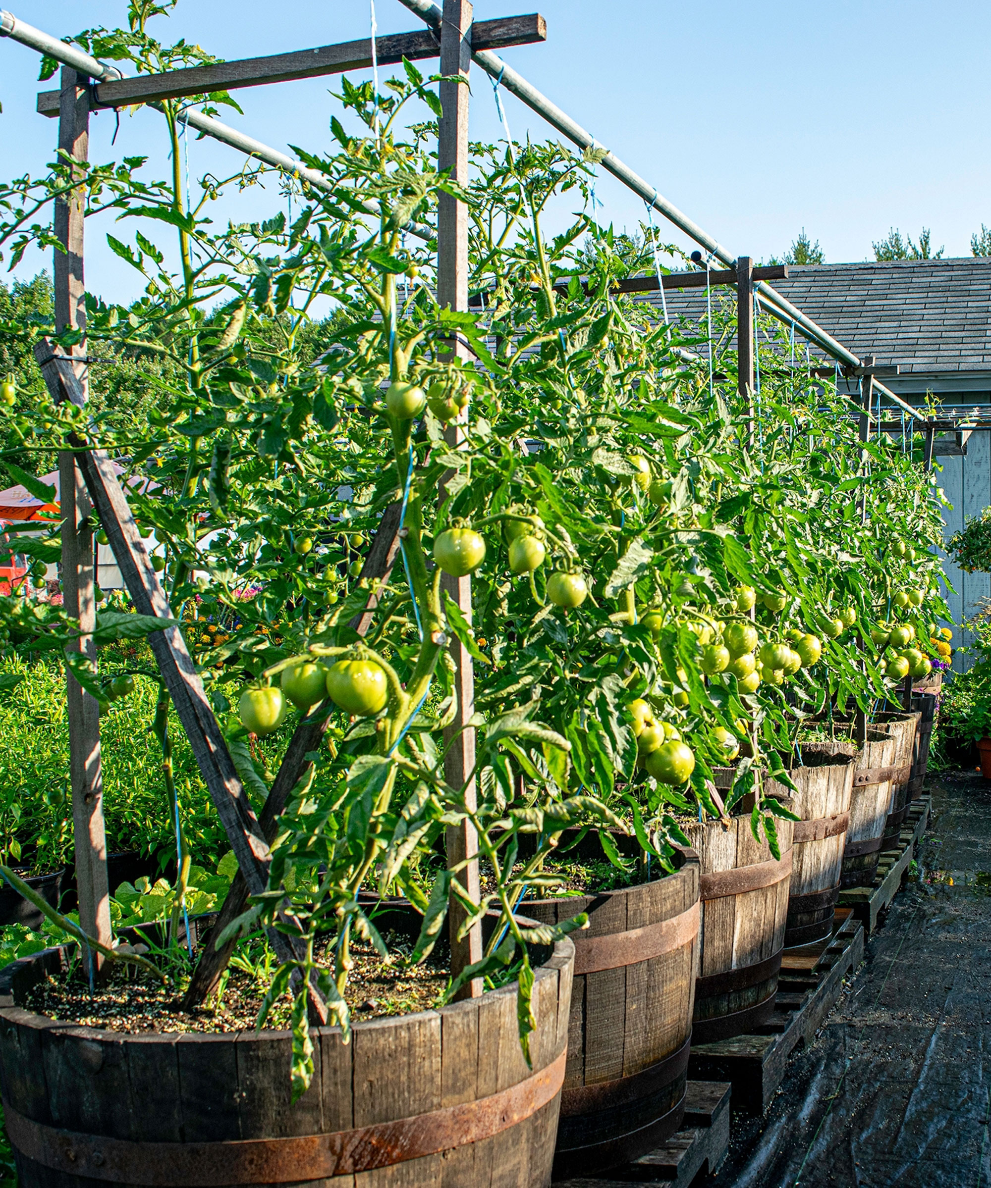 Un’altra ottima opzione verticale per i contenitori di grandi dimensioni è l’aggiunta di un traliccio, una gabbia o una struttura per aiutare a sollevare e sostenere le piante rampicanti. Prova il supporto per peperoni e melanzane della serie Pro di Burpee, facile da aggiungere a grandi vasi e fioriere rotondi e quadrati.
