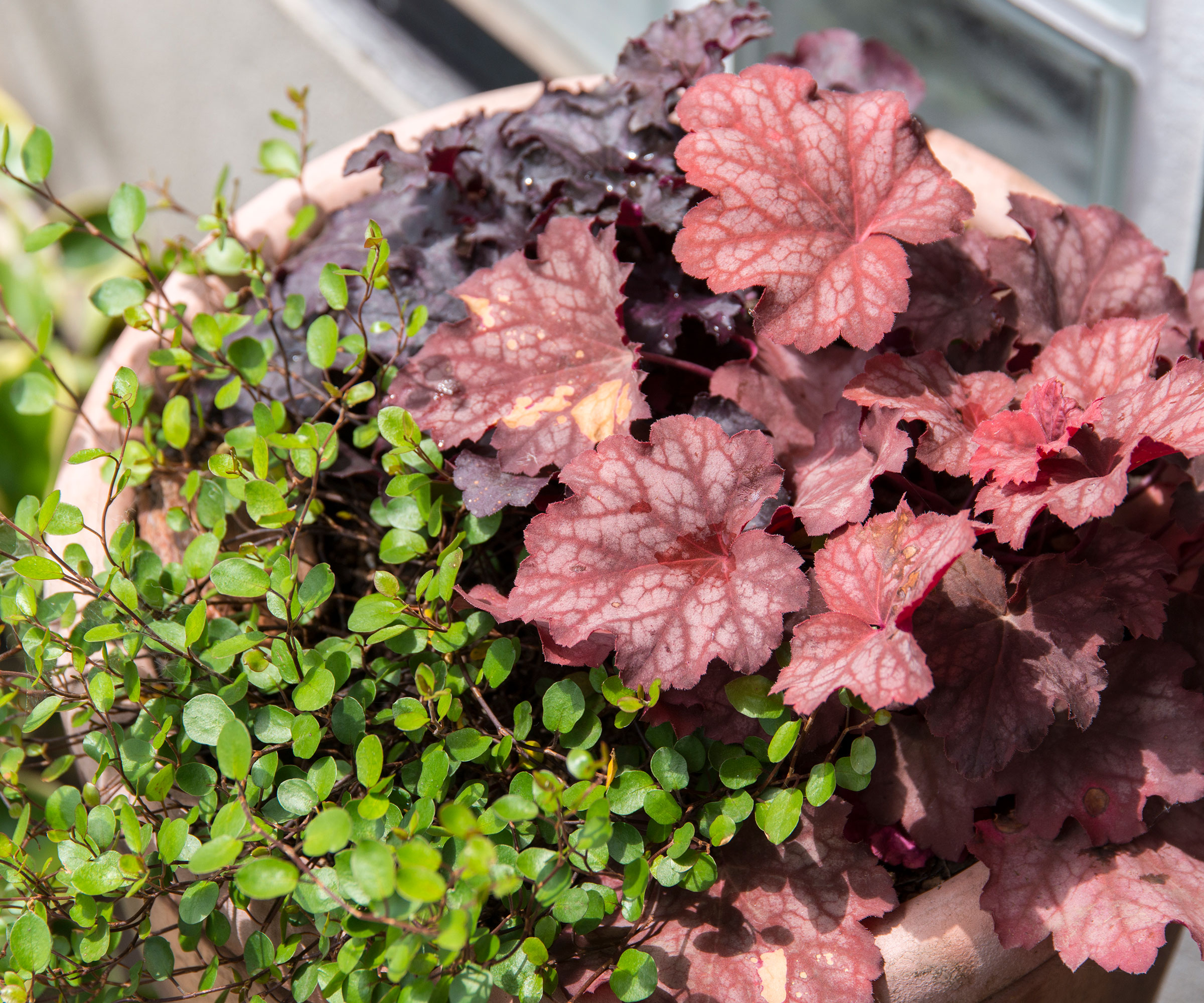 Per dare stabilità alla vostra composizione, aggiungete delle campanule (Heuchera) in una calda tonalità autunnale come “Caramel”, “Cinnamon Curl”, “Peach Flambé” o la pluripremiata “Toffee Tart” di Walmart. Queste piante creano uno splendido contrasto con il fogliame, con foglie increspate nei toni del ruggine, dell’oro o del bordeaux.