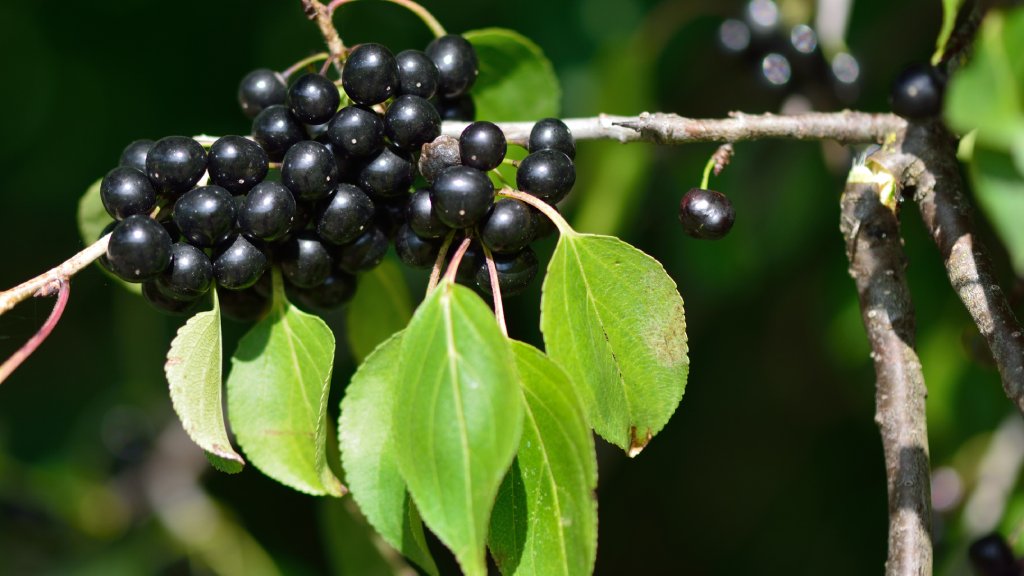 Il frangola comune (Rhamnus cathartica) è un piccolo albero che cresce tra i 3 e gli 8 metri di altezza.