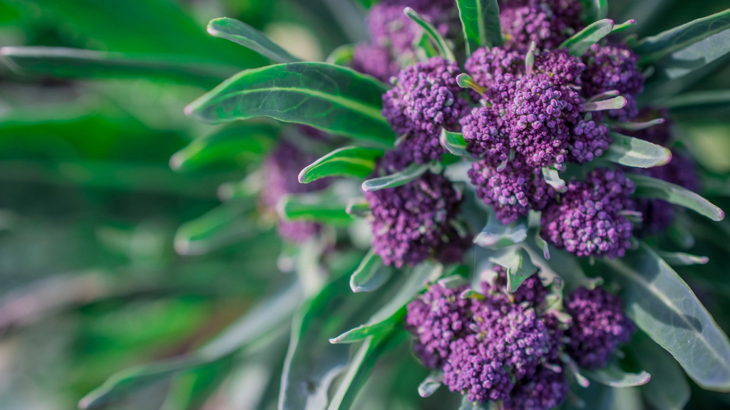 Il broccolo viola precoce (Brassica oleracea var. italica) è una varietà tradizionale molto diffusa in Italia e in Inghilterra. Questa bellezza è estremamente resistente al freddo, fino a -9 °C (15 °F). A differenza del Calabrese, che è grande, verde e grosso, le piante di broccoli viola hanno piccole cimette viola che vengono raccolte singolarmente. I broccoli furono portati dall’Italia dal Mediterraneo orientale e poi introdotti in Francia da Caterina de’ Medici in occasione del suo matrimonio con Enrico II nel 1533. Successivamente arrivarono in Gran Bretagna, dove furono chiamati “asparagi italiani” dal curatore del giardino degli speziali a Chelsea. Nel XIX secolo si potevano trovare varietà di tutti i colori, dal marrone al rosso e al crema, fino al verde e al bianco. Nella seconda metà del XIX secolo, gli americani coltivavano broccoli viola. I broccoli viola precoci sono piante grandi, alte circa 1,5 metri, con gambi di un verde brillante e fiori viola vivaci. I gambi, le foglie e le cime sono tutti commestibili. Le foglie ricordano la senape, mentre i gambi hanno un sapore simile agli asparagi. Il broccolo viola precoce ha un sapore più intenso rispetto al broccolo calabrese, con una leggera nota amara che potrebbe non piacere ai bambini, a meno che non siate genitori che evitano le crocchette di pollo e i bastoncini di carota.