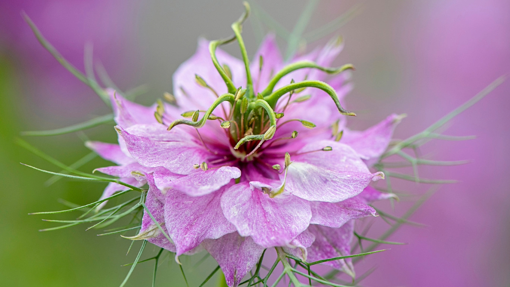 Con un nome comune come “amore nella nebbia”, si potrebbe pensare che la Nigella damascena abbia una storia romantica alle spalle. In realtà, però, questa pianta annuale è chiamata semplicemente “amore nella nebbia” per via dei suoi fiori blu brillante che sembrano fluttuare in una nebbia di foglie sottili e piumate di colore verde chiaro. Altri nomi con cui è conosciuta questa pianta sono finocchio selvatico, kalonji, cumino nero, carvi nero, devil-in-the-bush, fitch, fiore di finocchio, gith, coriandolo romano, schwarzkummel e finto cumino.