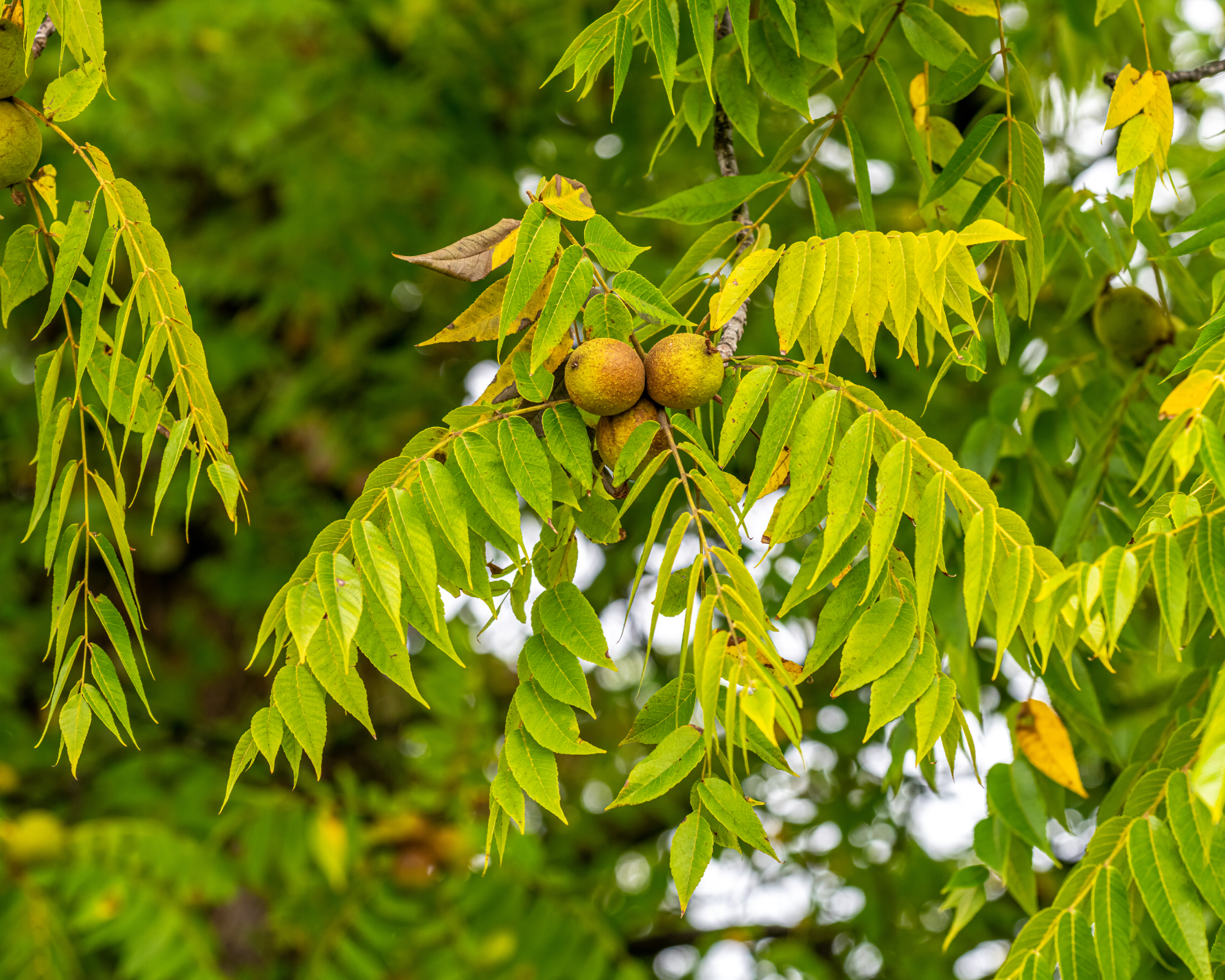 Il noce nero (Juglans nigra) è originario del Nord America ed è un albero di eccezionale bellezza. Le noci nere sono ottimi alberi da ombra per i paesaggi più grandi, poiché crescono fino a 16-33 metri di altezza. Il fogliame assomiglia a quello delle felci, di colore verde che in autunno diventa giallo brillante. Ma le radici sono estese ed emettono una sostanza chimica che inibisce la crescita di altre piante.