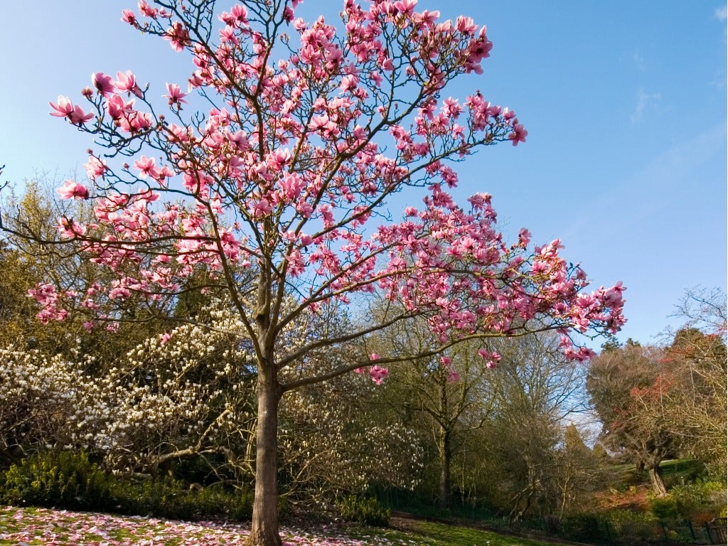 - Oyama magnolia (Magnolia sieboldii) – Med en höjd på endast 2 till 4,5 meter är denna magnoliaträdsort väl lämpad för en liten trädgård. Knopparna har formen av japanska lyktor och förvandlas så småningom till doftande vita koppar med kontrasterande röda ståndare.