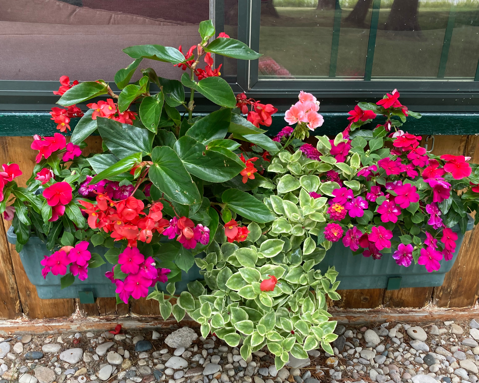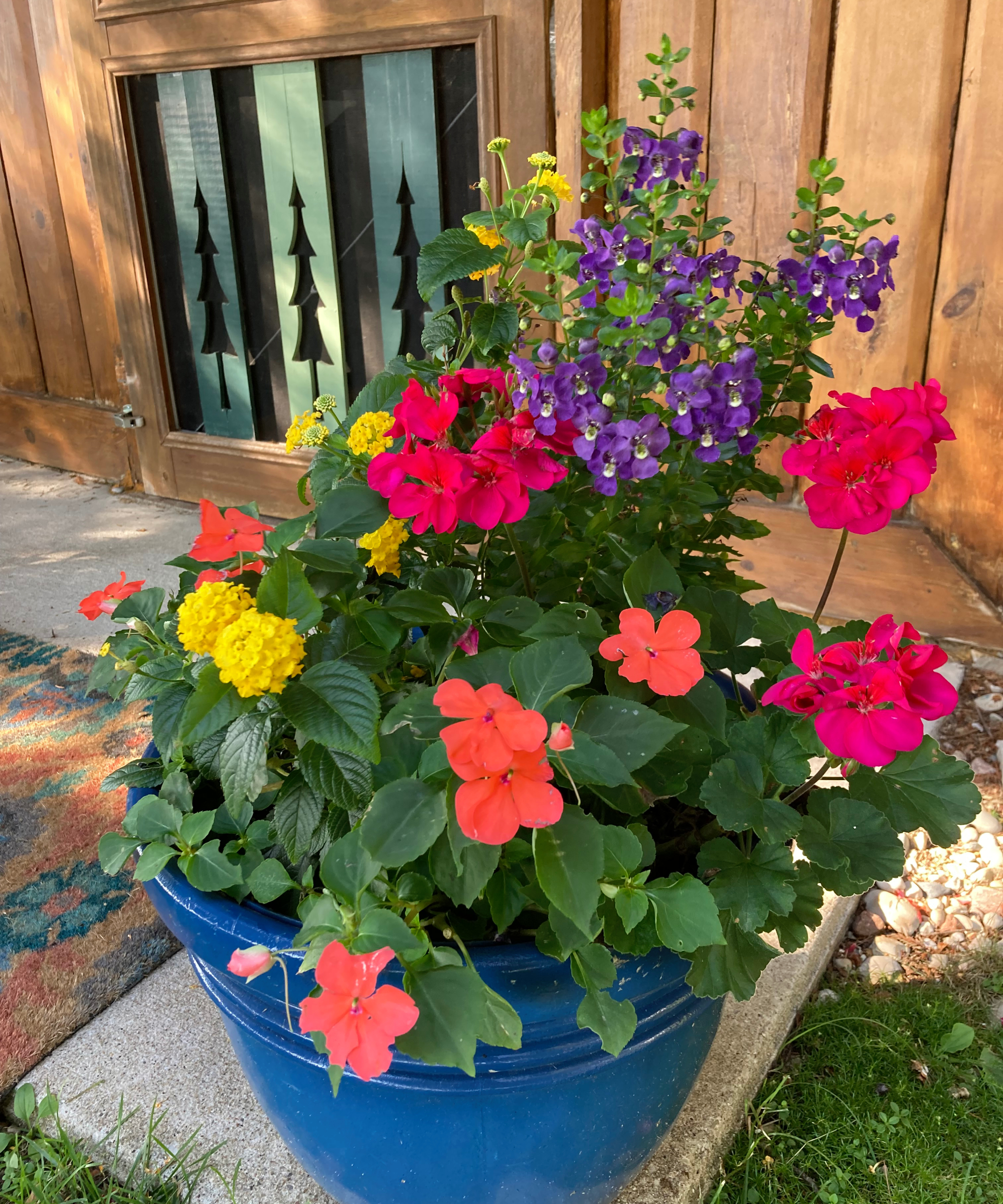 Det sista steget är att plantera din kruka. Mina måste-ha-enåriga växter för sommarplanteringar inkluderar alltid impatiens och pelargoner – ett annat knep jag lärt mig av min mamma. Dessa lättodlade blommor fyller snabbt ut och blommar om hela sommaren för en vacker uppvisning som varar från vår till höst.