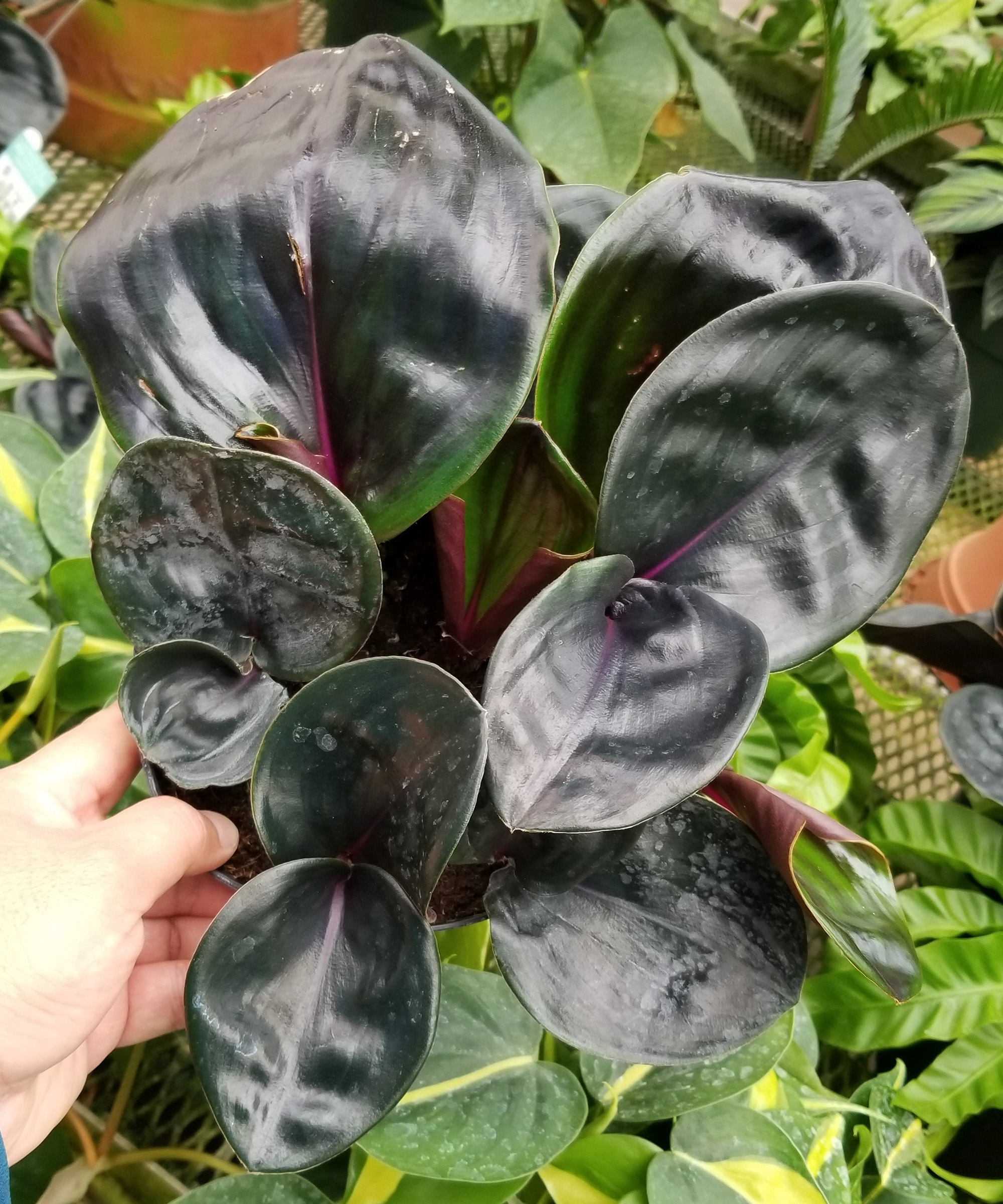 Det är bladen som får alla att jubla. De är tjocka, frodiga, glansiga, läderartade och så djupt lila att de ser svarta ut. Mittenribban och stjälkarna har en mörkrosa nyans och bladet har svaga inslag av grönt över ytan.