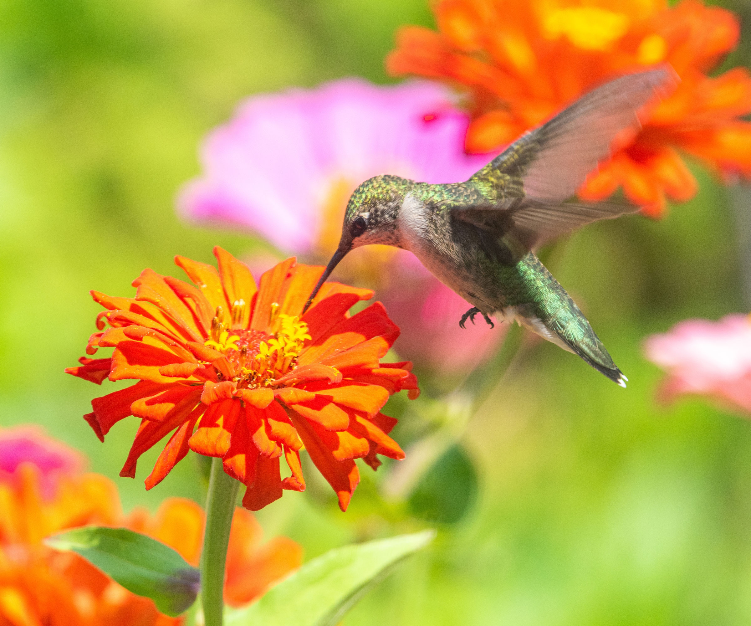 Zinnia (Z. elegans, Z.angustifolia) växer lätt från frö i trädgården. Det finns flera sorter och kultivarer, och alla lockar kolibrier. Färgglada, tusensköna-liknande ettåriga växter växer på stjälkar som blir 0,3-1 m höga. Du kan plantera zinnias för snittblommor, blandade rabatter och kompakta odlingar. Välj bara en bördig, väldränerad jord i full sol.
