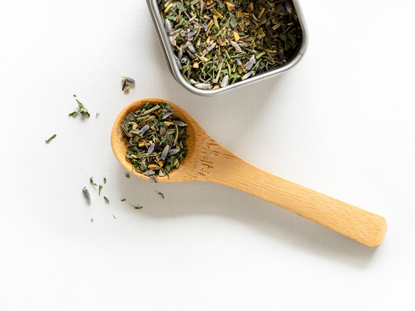 Krossa stora blad och lavendelblommor innan du mäter upp örterna i en blandningsskål. Rör om försiktigt för att blanda örterna ordentligt. Om du vill ge bort örterna som present kan du fylla dekorativa burkar med herbes de provence-blandningen. Lägg till en rosett, en kvist torkade lavendelblommor och en presentetikett.