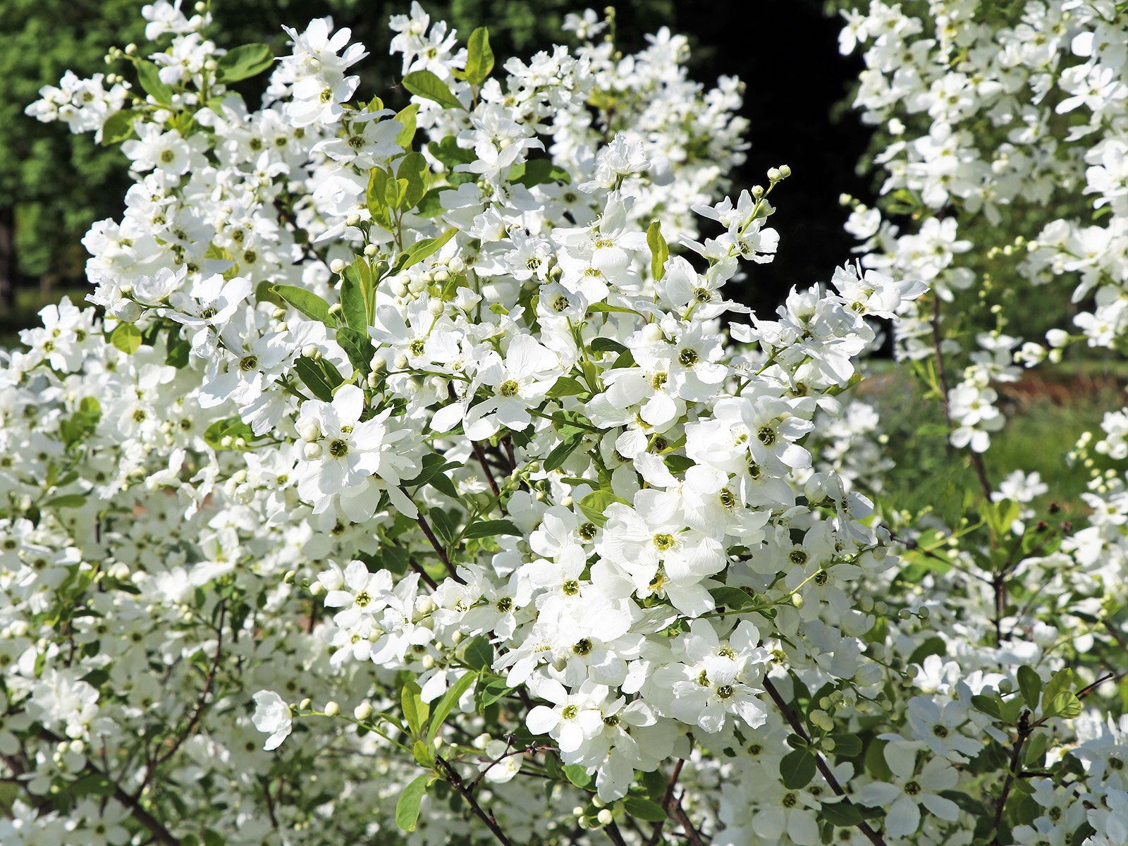 - ’The Bride’ (Exochorda x macrantha) – Denna buske blir cirka 1,2 meter hög och har ett hängande växtsätt.