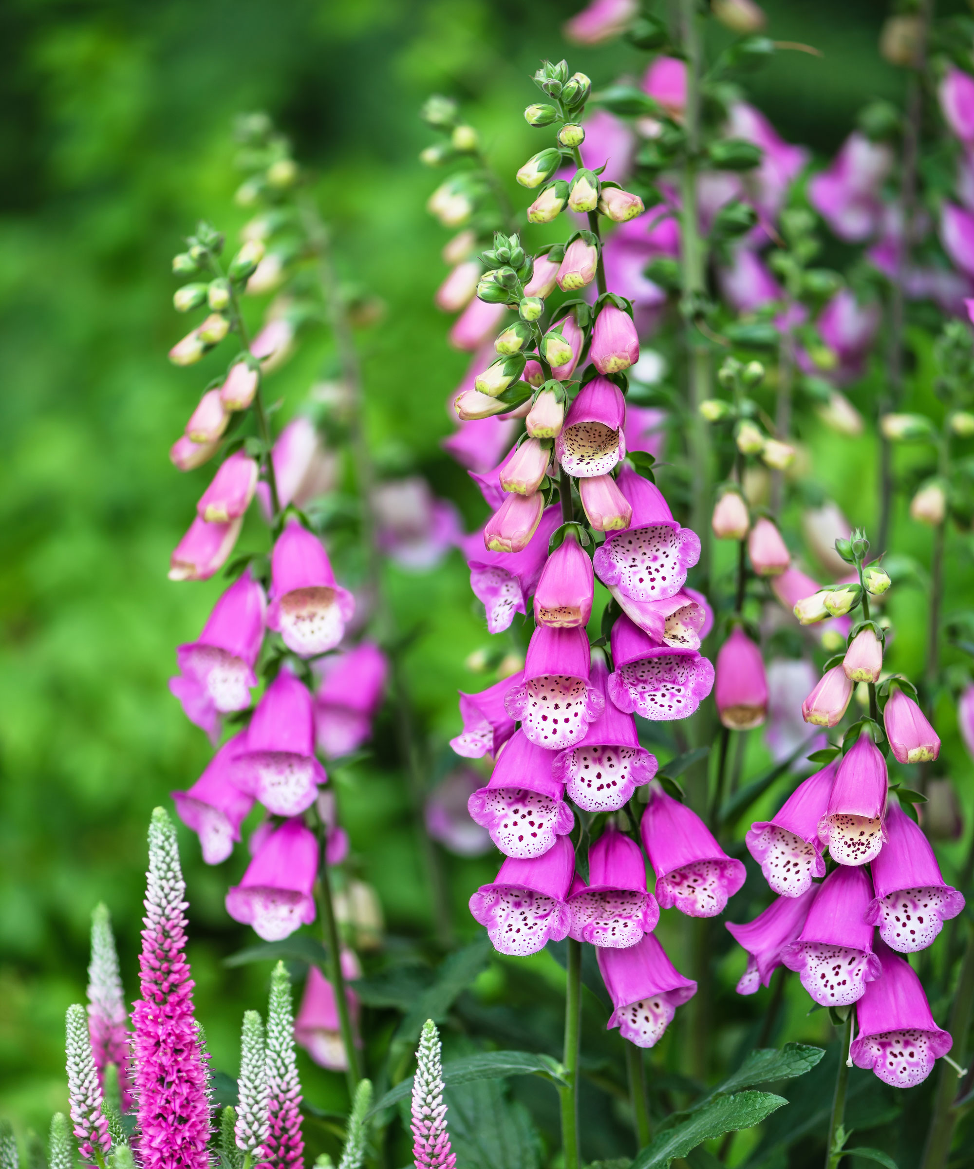 Fingerborgsblommor, som är tvååriga, har liknande höjd och blomningstid och kan ge prydnadsrabatter ett dramatiskt intresse. Även om alla delar av växten är mycket giftiga, älskar pollinerare deras blommor. Du kan förvänta dig att mogna växter sprider sig fritt och släpper frön säsong efter säsong.