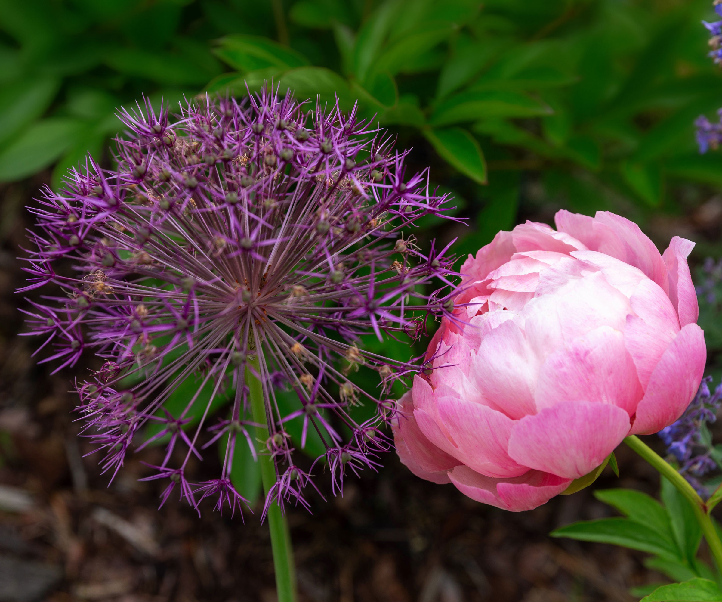 Flera arter av blommande allium blommar samtidigt och är utmärkta kompanjoner till pioner. De flesta börjar blomma i början av sommaren och lockar till sig stora mängder pollinerare. Kompletterande lila toner kombineras med pioner för en attraktiv vårpalett.