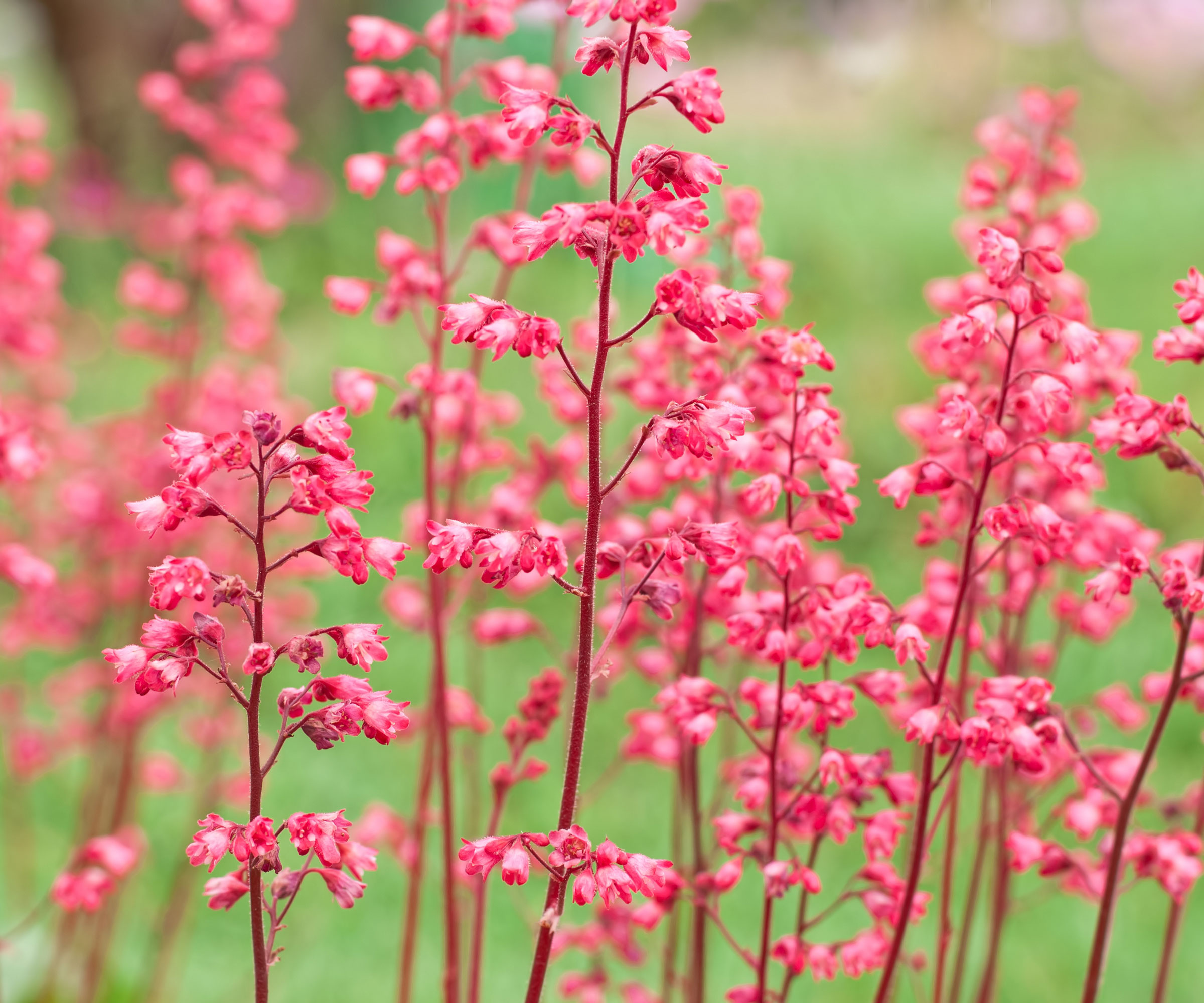 Heuchera, även känd som korallklockor (Heuchera spp.), är en buskig perenn med olika bladfärger som växer i halvskugga. I början av sommaren lockar små blommor kolibrier under en begränsad tid. Växer upp till 0,6 m hög. USDA-zonerna 3-9.