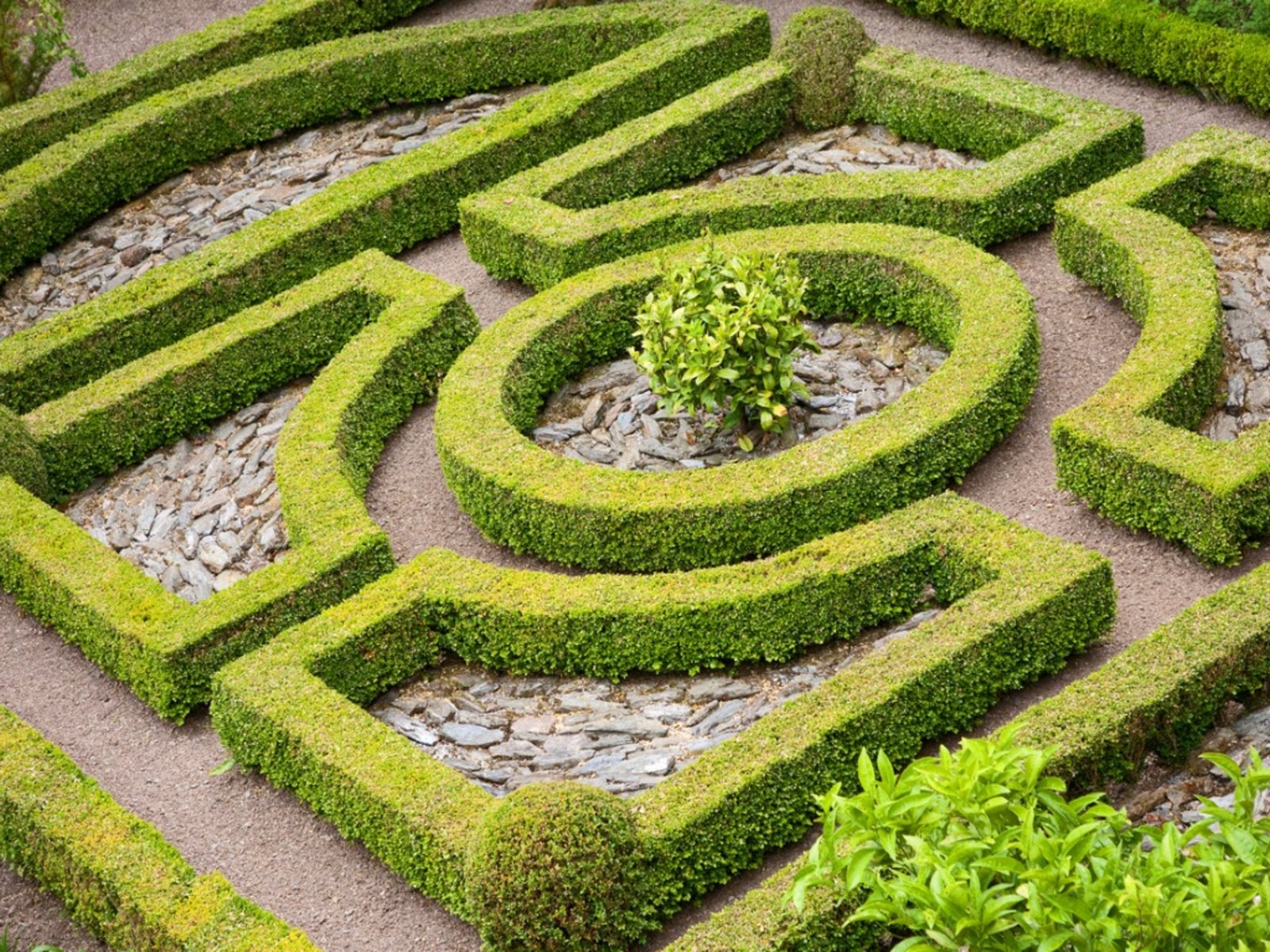 Den yttre kanten av designen bör innehålla lättskötta växter som inte växer sig så höga att de skuggar de inre exemplaren. Buksbom är traditionellt, men idegranar eller andra växter som svarar bra på beskärning är också lämpliga. Egentligen fungerar alla växter som är vintergröna och kan hållas inom vissa gränser. I det mönstrade inre användes traditionellt växter som ljung, lavendel och andra buskiga örter. Du kan välja att skapa en fokuspunkt i mitten, till exempel ett dvärgfruktträd, en fontän, ett fågelbad eller en solur. De örtartade rabatterna strålar ut från mitten av detta. När det är dags att plantera, börja i mitten och arbeta dig utåt. Att skapa parterrträdgårdar på detta sätt är enklast och hindrar dig från att trampa på ditt arbete när du planterar designväxterna. Vattna och se hur din design fylls och förändras från säsong till säsong, och lägg till färg och grönsaker om de ingår i din plan.