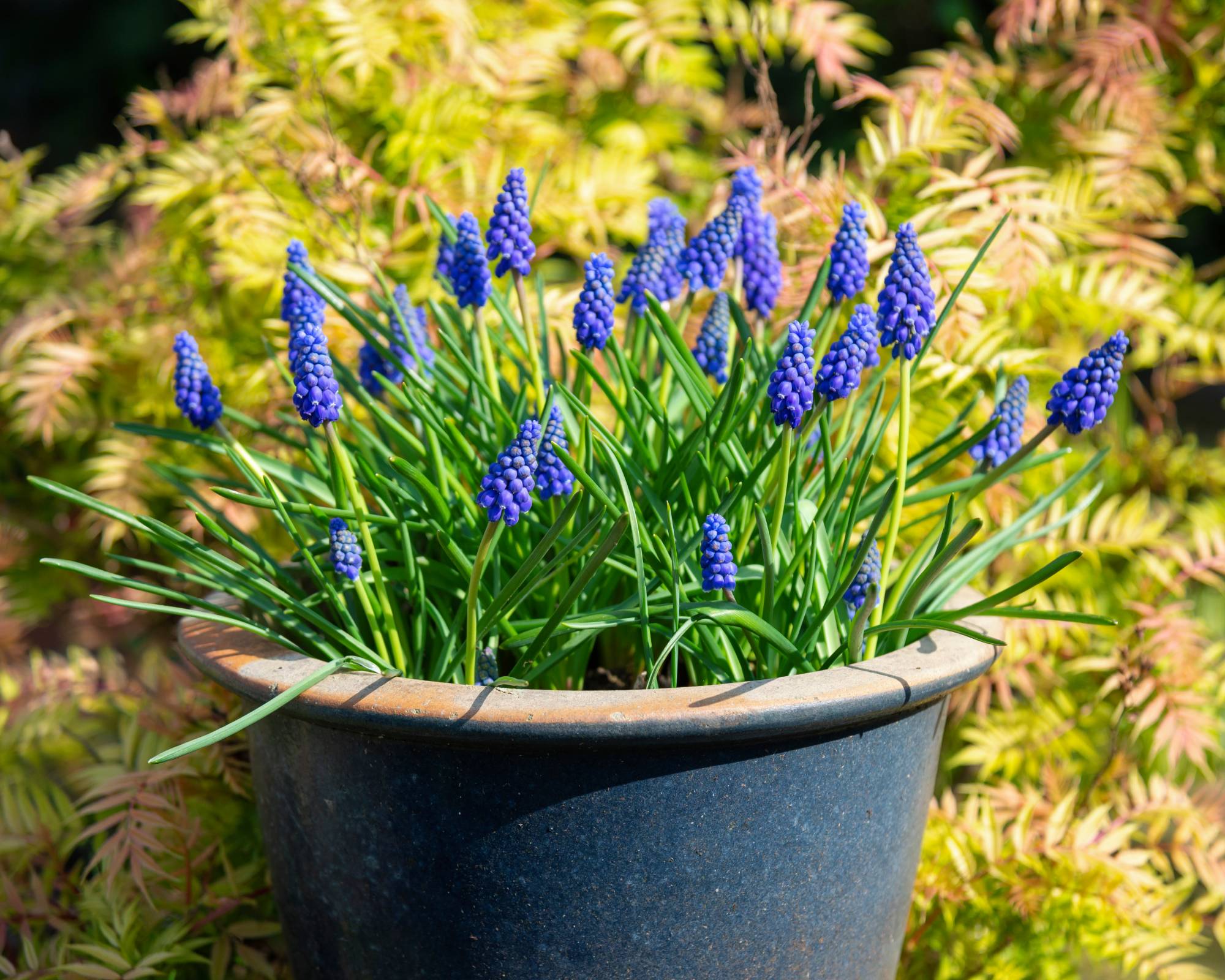 Druvhyacinter har en muskig doft och hårda lökar som ekorrarna inte bryr sig om. De innehåller också saponiner och andra bittra ämnen som avskräcker från att äta dem. Deras blommor i april, som små blå eller lila druvklasar, är perfekta för att kantsticka rabatter.