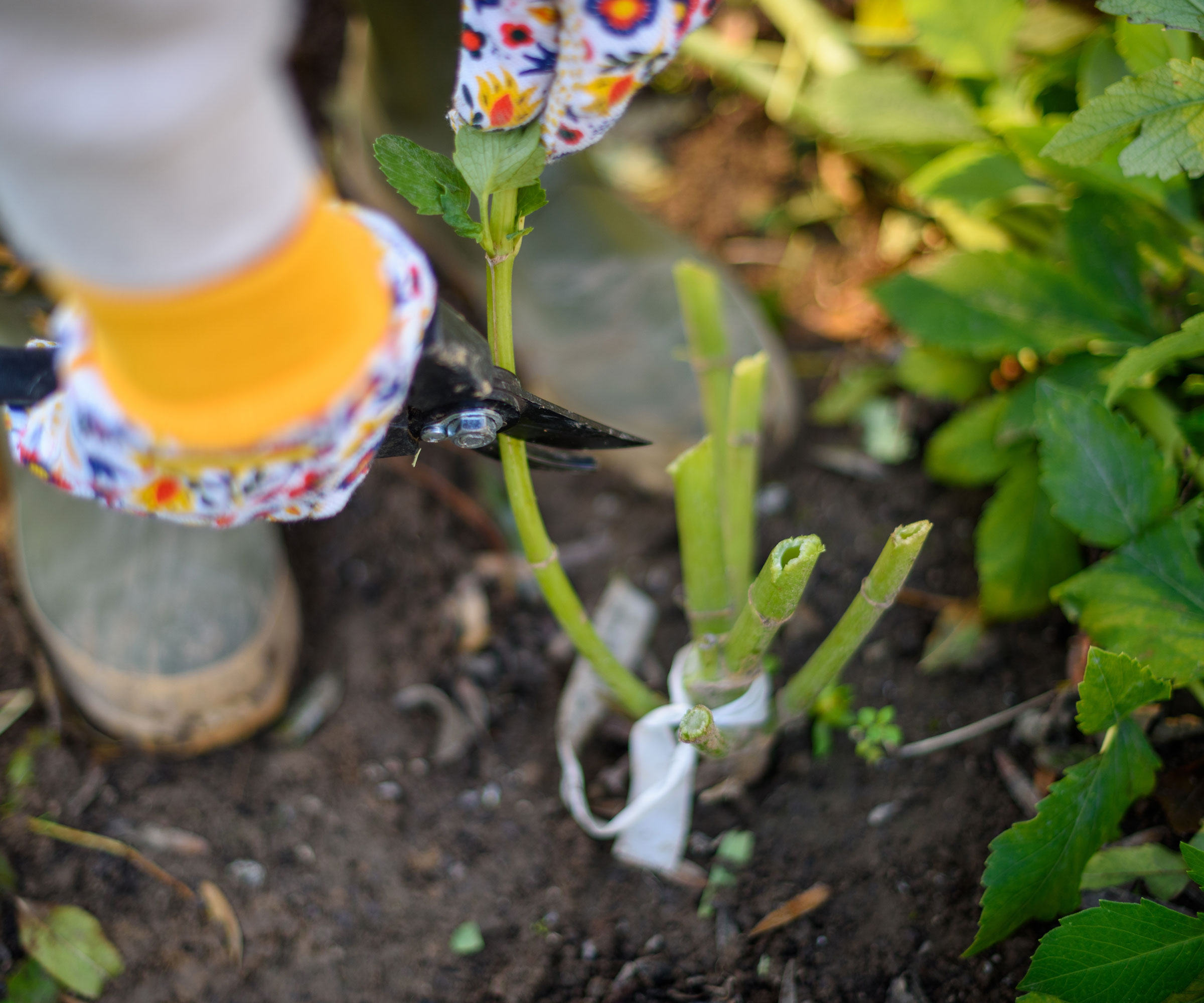 När du är redo, ta rena, vassa sekatörer (jag älskar mina Felco 2-sekatörer, som finns på Amazon) och klipp tillbaka stjälkarna till 10–15 cm ovanför markytan. Att lämna kvar en liten stjälk gör det lättare att lyfta knölarna eller ger lite extra höjd för mulching om du planerar att lämna dem i marken.