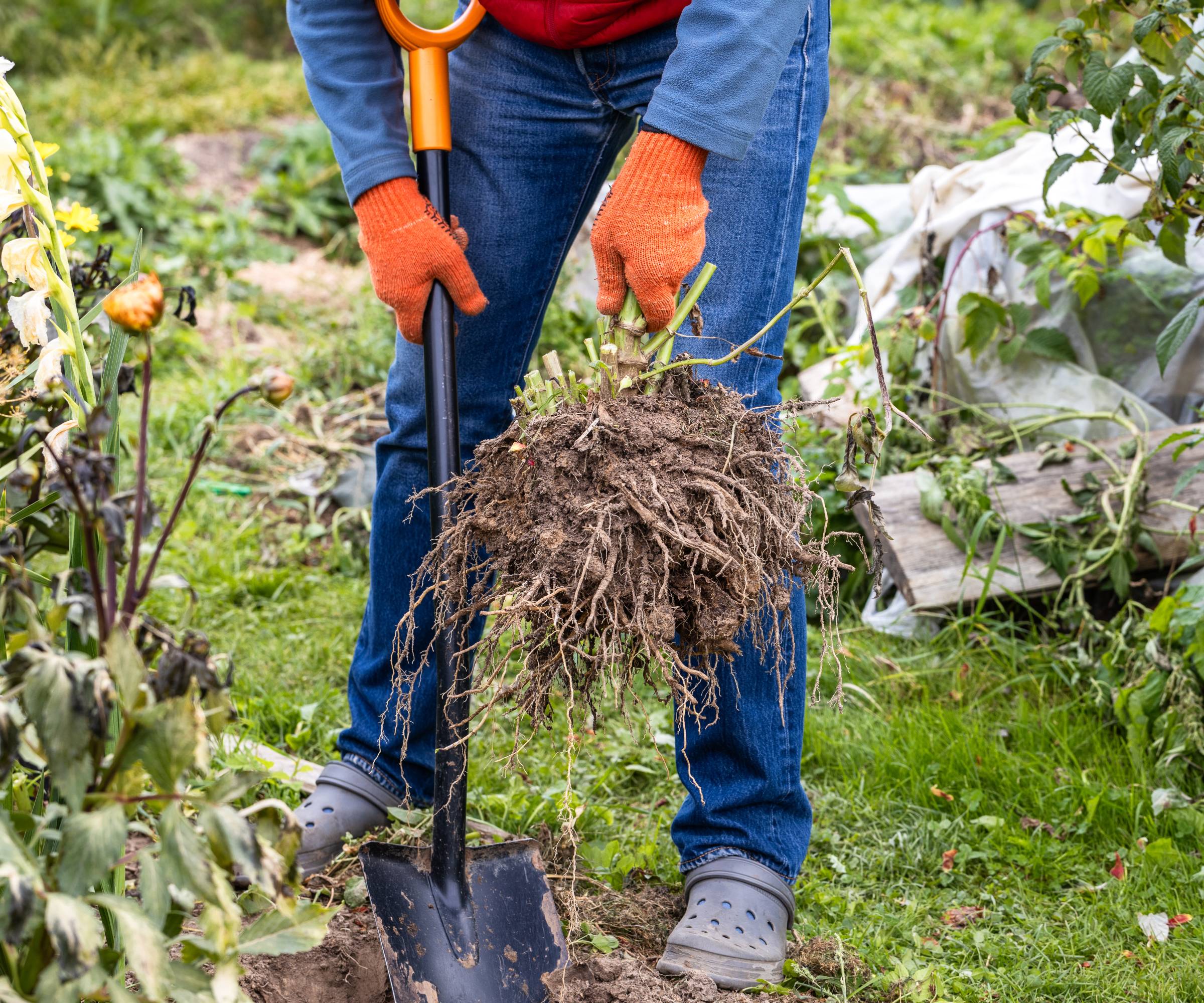 Även om du vill att dahliorna ska ha svartnat av frost, ska du inte gräva upp dem när marken är frusen. Om jorden är torr eller kompakt, vattna lätt dagen innan för att underlätta arbetet.