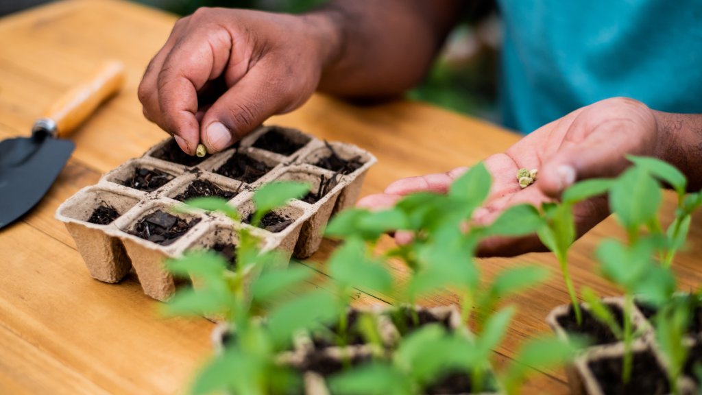 Ska man inte köpa behållare alls? Det stämmer. För den ultimata hållbara såkrukan, använd jord. Du kan köpa eller göra en DIY-jordblockerare, en anordning som, när fuktig jord eller planteringsjord har satts in, komprimerar mediet och sedan släpper ut det i form av små block eller pluggar. Du kan göra din egen med hjälp av soppburkar eller PVC-rör om du känner dig särskilt händig.