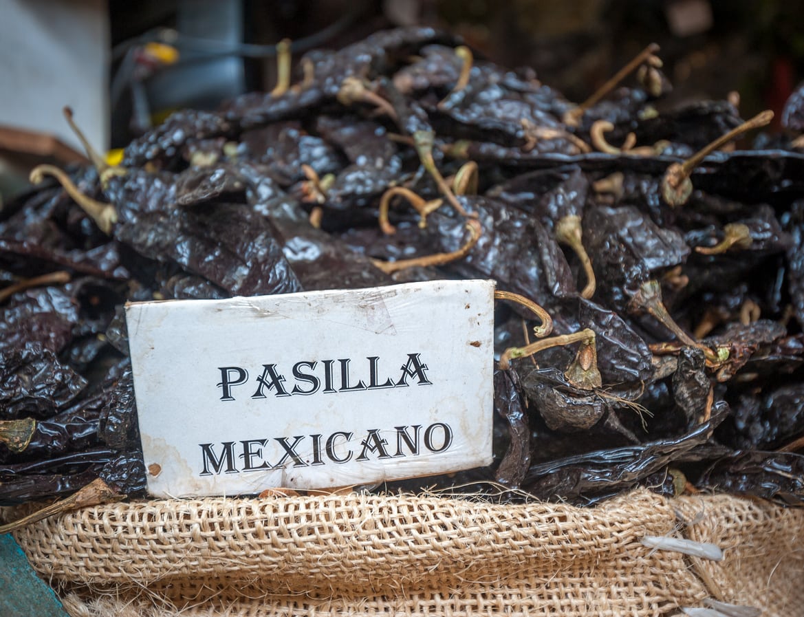 Vad är pasillapeppar? Denna chili kallas också pasilla bajio och dess namn på spanska betyder bokstavligen ”liten russin”. Detta är något missvisande, eftersom pepparn är mycket större än ett russin och vanligtvis når 15-23 cm i längd och 2,5 cm i diameter. Det är paprikans färg, som blir mycket mörkbrun när den mognar, som ger växten sitt namn. Pasillas kan skördas gröna och omogna för att göra såser och salsor. De kan också skördas mogna och torkas. Det är i denna form som de används, tillsammans med ancho- och guajillo-chili, för att göra den klassiska mexikanska molesåsen. Pasillapaprika är inte särskilt stark. De har en Scoville-grad på 1 000 till 2 500, vilket innebär att de är mindre starka än en mild jalapeño. När de mognar och blir mörkare i färgen blir de också starkare. De har oftast en rik, behaglig, nästan bärliknande smak.