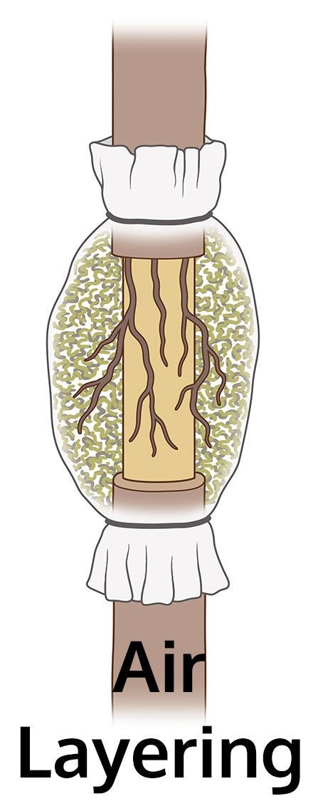 Luftlagring – Luftlagring görs genom att skala bort barken från mitten av en gren och täcka det exponerade träet med mossa och plastfolie. Rötter bildas inuti mossan och du kan skära av den rotade spetsen från växten.