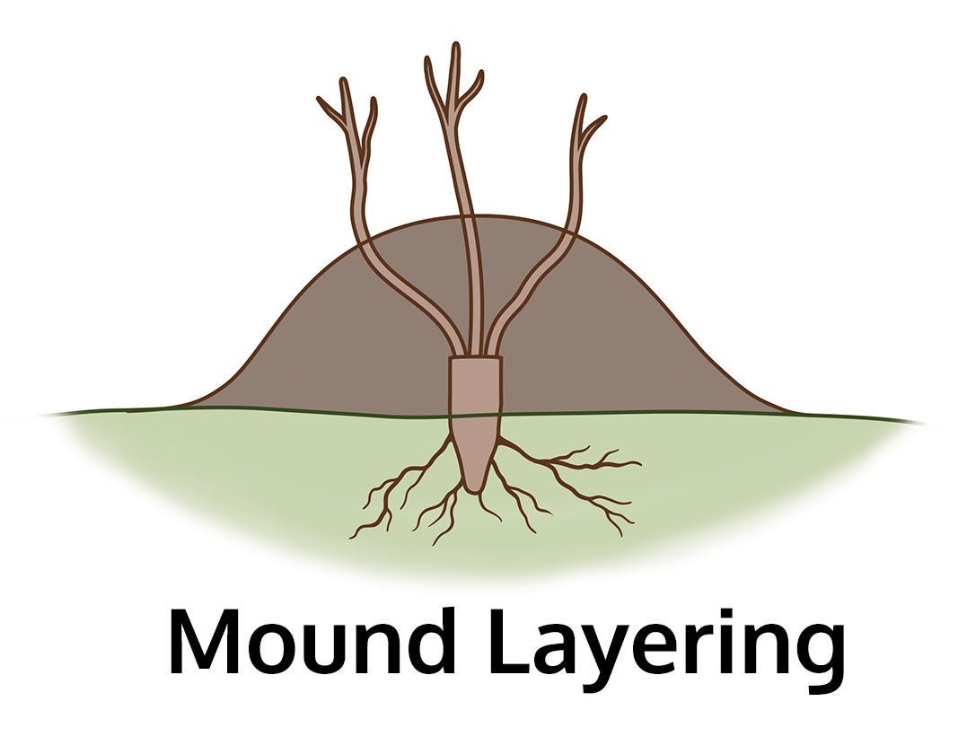 Mound-lagring – Mound-lagring används för buskar och träd med tunga stammar. Klipp ner huvudstammen till marken och täck den. Knopparna i änden av stammen kommer att bilda ett antal rotade grenar.
