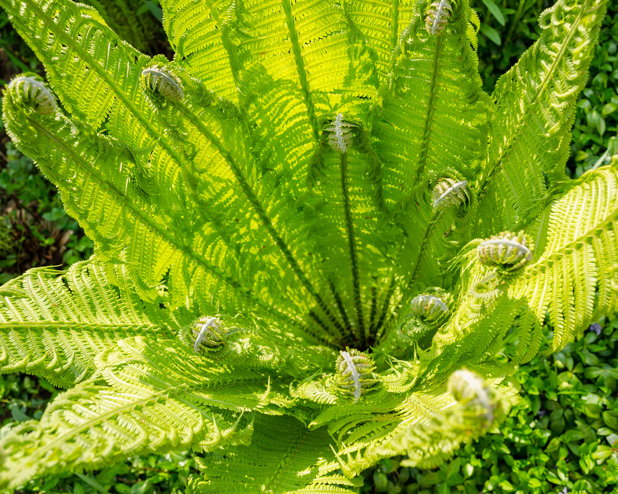 Ormbunkar ger intressant bladverk och bra täckning för bleknande lökar. De flesta ormbunkar trivs bäst i skuggiga lägen, så använd dem under träd där lökarna blommar innan trädens löv skuggar dem för mycket. När lökarna börjar blekna kommer ormbunkarna snabbt att börja slå ut och täcka dem.