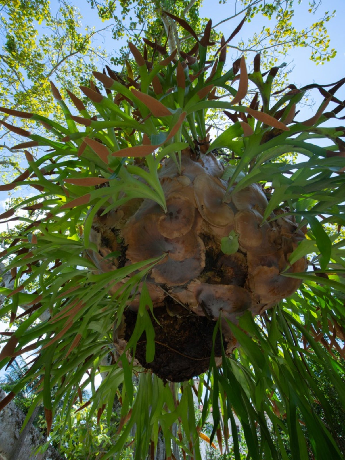 Staghornsormbunkar har stora platta basblad som växer som ett skydd över plantans rötter. När en staghornsormbunke växer vilt i grenen på ett tropiskt träd eller på en klippavsats, hjälper dessa basblad till att samla upp vatten och fallna växtrester från tropiska regn. Med tiden bryts växtresterna ned, vilket hjälper till att hålla kvar fukt runt plantans rötter och frigöra näringsämnen när de bryts ned. Utöver detta absorberar staghornsormbunkens basblad mer vatten och näringsämnen från den fuktiga luften. Staghornsormbunkar producerar också upprättstående, unika blad som liknar hjorthorn. Den primära funktionen hos dessa upprättstående blad är fortplantning, inte vattenabsorption. I hemmet eller trädgården kan staghornsfernens vattenbehov vara högre, särskilt under perioder av torka och låg luftfuktighet. Dessa trädgårdsväxter fästs vanligtvis på något med sphagnummossa och/eller andra organiska material under basbladen och runt rötterna. Detta material hjälper till att bibehålla fuktigheten. När man vattnar en fastsatt staghornsfern kan vattnet ges direkt till sphagnummossan långsamt med en lång vattenkanna med smal spets. En långsam droppning gör att mossan eller annat organiskt material blir helt mättat.